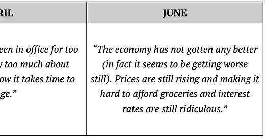 In May, three of these six voters also named immigration as their biggest concern about Democrats. Two said it directly tied to how they feel about their families’ safety, and one wrote: “The Democrats have allowed immigration and border security to become unmanageable. They have allocated taxpayer funds to financially support undocumented immigrants when those resources should be used to improve the lives of American citizens.”